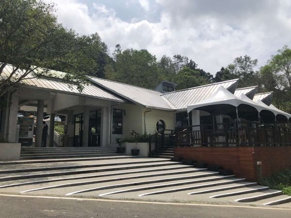 走完景觀步道會看到柏油馬路,看到柏油馬路就知道出景觀步道了,繼續往前走就會看到餐廳囉,餐廳外觀長上面那樣,是白色的木屋建築。