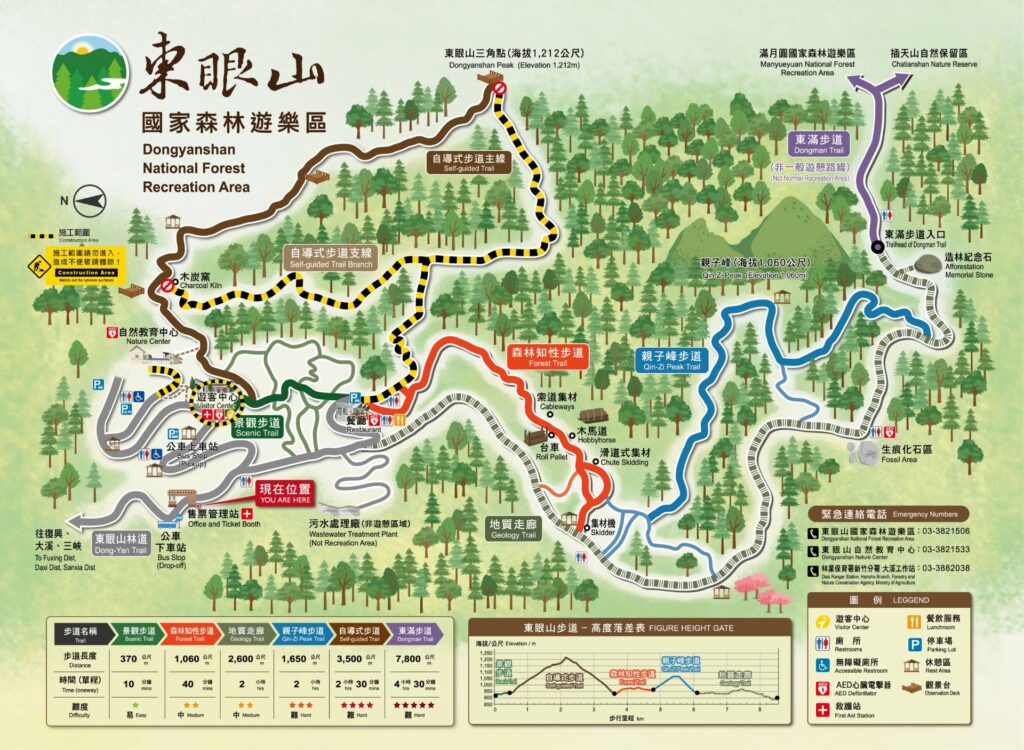 通常來東眼山都是從售票口入園然後往遊客中心走,這段路大概有個500公尺,到了遊客中心後就有兩個路線可以選擇,如下面的導覽圖。